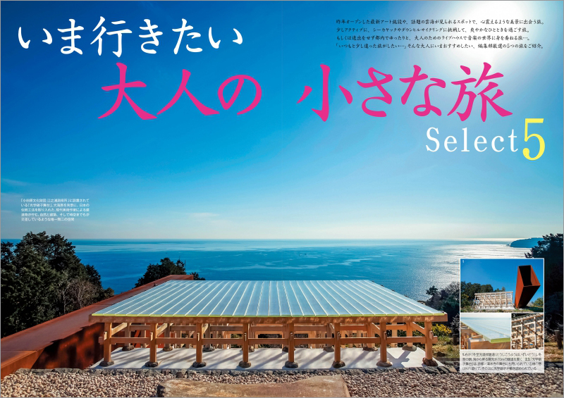 もちろんご好評をいただいている基本の特集記事も充実。「大人の街めぐり」では都内を中心に<慣れ親しんだ街の新たな表情に出会える>エリアを取り上げ、「大人の美味しい旅」では高原の食材を使ったフレンチ、海沿いの町の新鮮な魚介、隠れ家のような空間でたぐるそば、など<料理を味わうために行き先を決める>価値のあるスポットを厳選。「大人の遠足」では「花」「水辺」「山」それぞれのとっておきの絶景スポットに加え、非日常的な空間やものづくり体験をご紹介。大人ならではの感動、愉しみが味わえます。