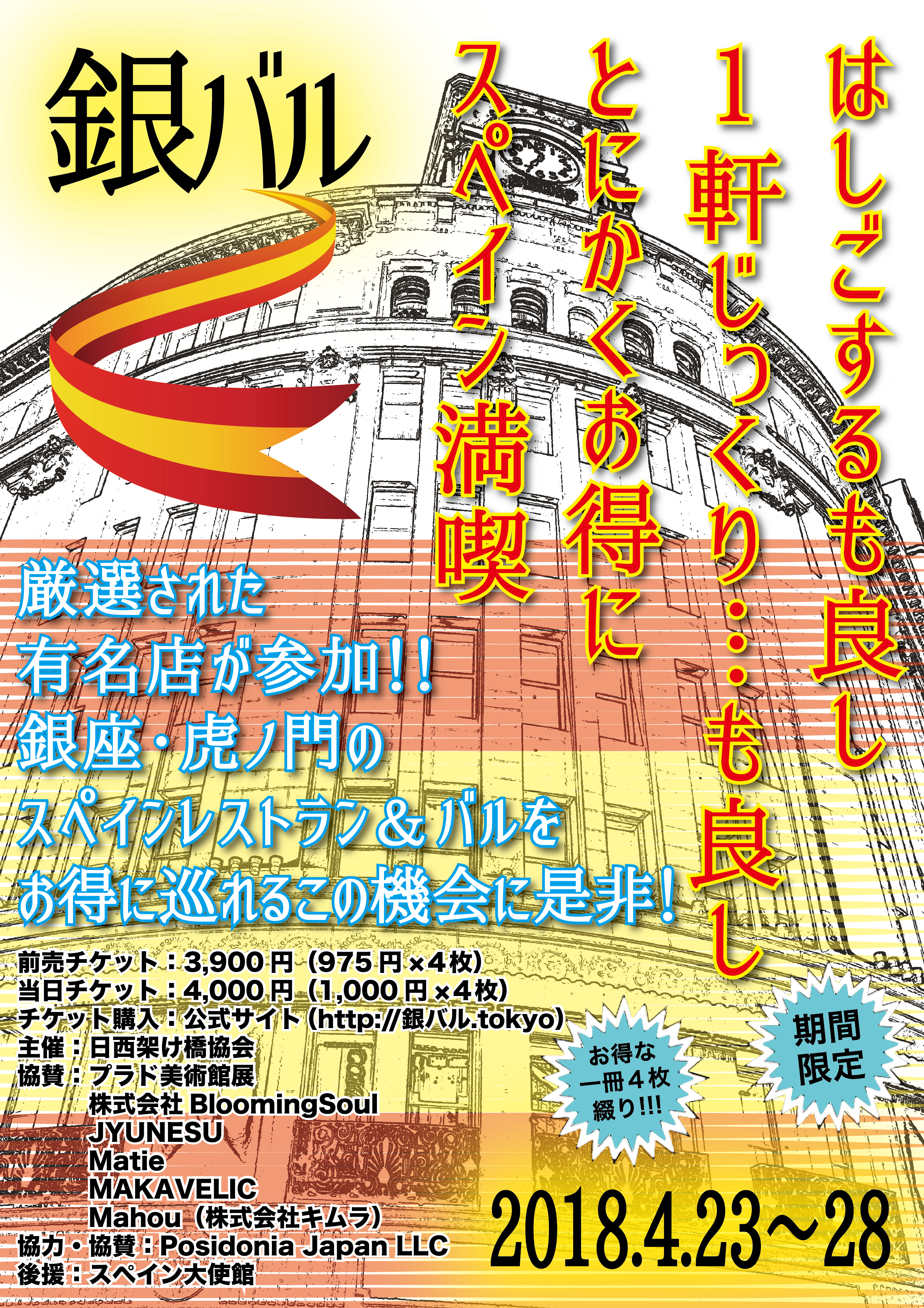 『銀バル』の公式サイトにおいて、1冊4枚綴りのお得なチケットを購入し、銀座と虎ノ門にあるスペインレストラン、及び、スペインバルを自由に巡ることができます。前売チケットは、1冊3,900円(975円×4枚)、当日チケットは、1冊4,000円(1,000円×4枚)となっております。
