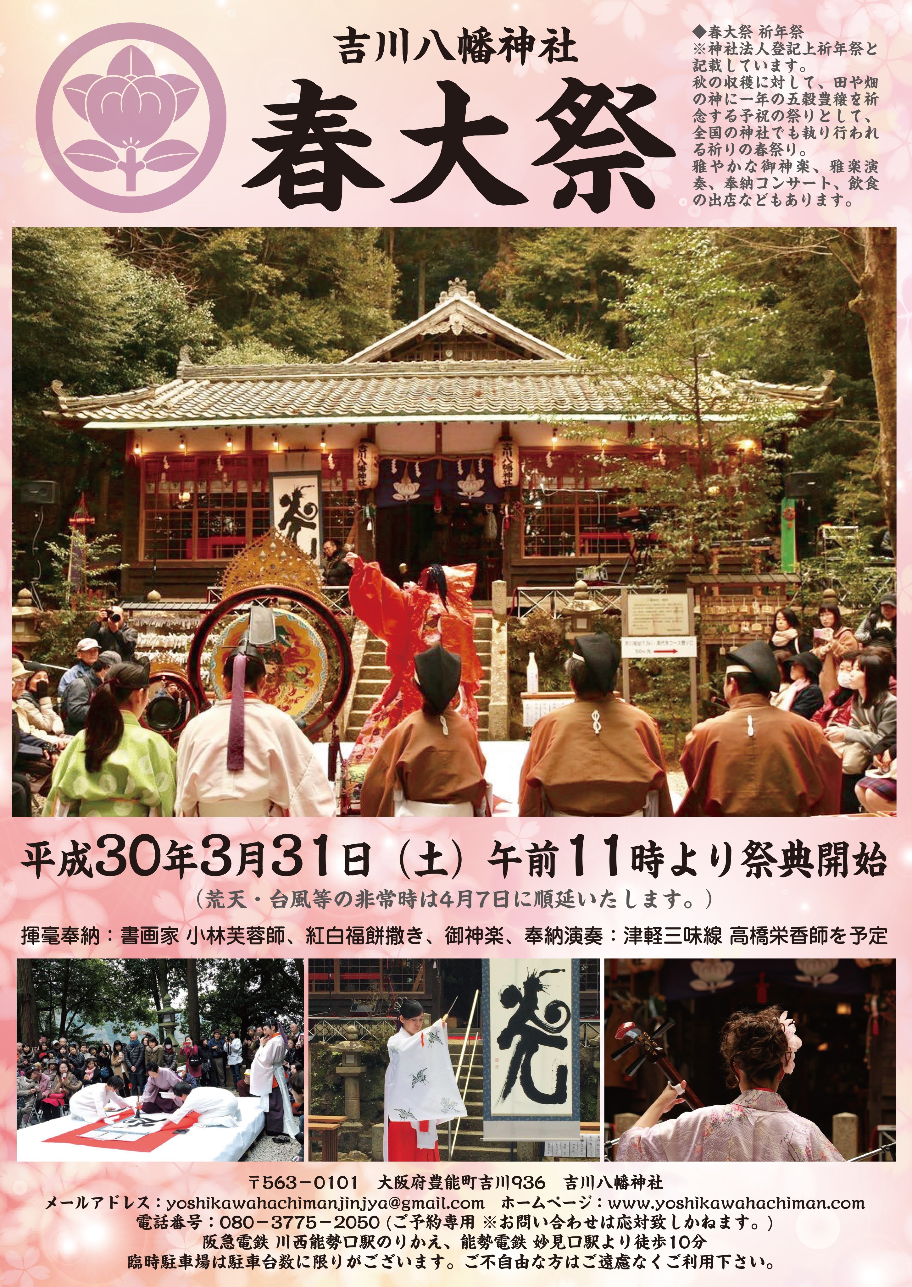 秋の収穫に対して、田や畑の神に一年の五穀豊穣を祈念する予祝の祭りとして執り行われる春祭り。平成30年3月31日(土)午前11時より祭典開始、書画家 小林芙蓉(こばやしふよう)師による揮毫奉納があります。