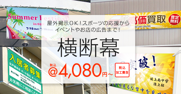 横断幕はスポーツの応援やイベント告知、サブ看板や広告など幅広く利用されており、大きなビジュアル面が特徴です。他にも、丸めれば簡単に持ち運べる携帯性や、ポスターと違い繰り返し使用できる点も魅力的です。オリジナルプリント.jpでは、そんな横断幕がWEB入稿で簡単にご注文が可能。「インパクトを出したい!」「選手やお客さんの気持ちを高めたい!」オリジナルデザインの横断幕で、空間を盛り上げてみませんか?