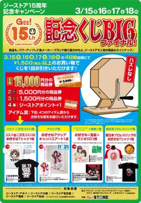 ジーストア15周年企画もいよいよ3月で終了。毎月15日に開催していた記念くじもこの3月は【4日間にパワーアップ】いたします。