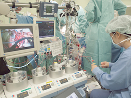 ICU内で臨床工学技士は、医師、看護師、薬剤師、管理栄養士、理学療法師など、多くの専門家とチームを組んで治療に当たっています。臨床工学技士は、人工心臓や人工呼吸などの生命維持に欠かせない医療機器の操作や、管理の中心的な役割を担っています。
