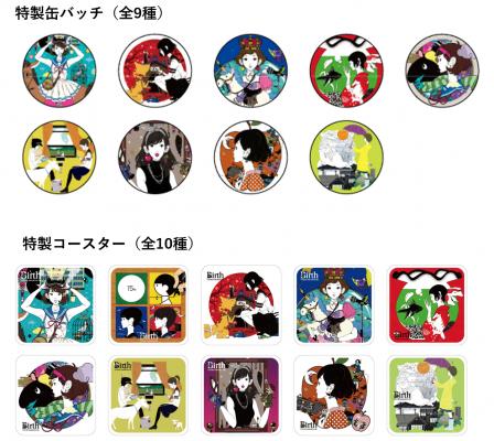 中村佑介プロデュースの映像作品「Birth YUSUKE NAKAMURA VR」のオリジナルグッズをご購入いただいたお客様には、中村佑介のイラストが描かれた特製缶バッチ全9種から1個と、特製コースター全10種から1枚をプレゼント。