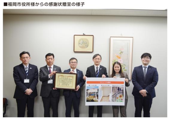 感謝状は、福岡市役所にて福岡市保健福祉局局長の永渕英洋様から手渡されました。 永渕様は今回の活動に対し「福岡の企業がこのような形で地域に貢献していただけるのは大変ありがたい。今後もぜひ全国へ広げて欲しい」と述べられました。