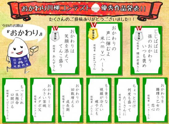 米穀の製造加工および販売を手掛ける株式会社むらせ(本社:神奈川県横須賀市米が浜通1-6、代表取締役:村瀬 慶太郎)が運営する“むらせライスサポーターサイト” において、2月1日(木)から2月28日(水)まで開催した、「おかわり川柳コンテスト」の結果を3月15日(木)に発表いたしました。