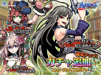 2018年3月20日(火)から、期間限定で特定キャラクターの召喚確率がアップする「ニューフェイス」ガチャを開催いたします。本イベントでは新キャラクター「ビリー・カティ」(CV:斎賀 みつき)や、ピックアップ対象のキャラクター「浅間コノハ」「ガータ」の召喚確率がアップします。