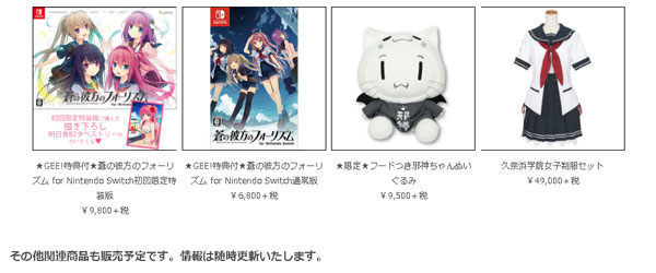 展覧会会場では、GEE!特典付きの「蒼の彼方のフォーリズム for Nintendo Switch」や販売店限定の「フードつき邪神ちゃんぬいぐるみ」など関連グッズが並ぶ物販コーナーも展開。お気に入りのヒロインや作品の世界観を楽しめるグッズの数々をラインナップ致します。