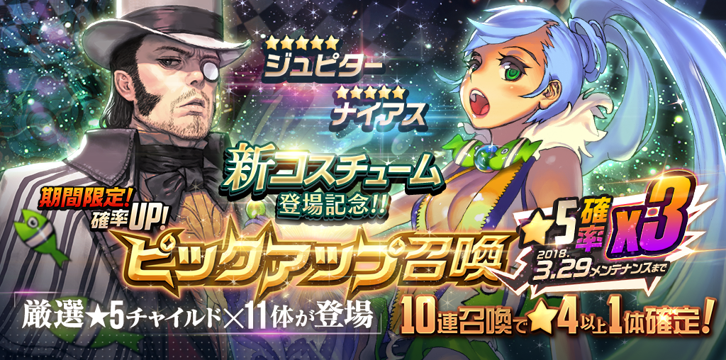 また、新コスチューム追加にあわせまして、★5「ジュピター」、★5「ナイアス」を中心とした★5チャイルドの召喚確率がアップしているピックアップ召喚を追加しましたことをお知らせいたします。