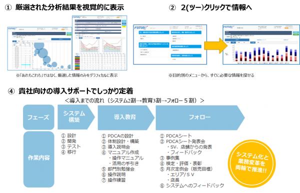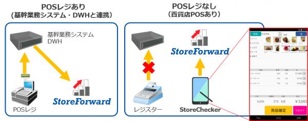 上記の課題を解決し、デパ地下・駅ナカであっても、「提案型・問題解決型小売業の展開」に必用な「仮説-検証による変化対応力の強化と店舗業務の変革」を支援する仕組みとして、新システム「StoreForward(+StoreChecker)」を提供します。