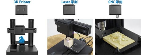 1台で3Dプリント、レーザ彫刻、CNC彫刻の3役で使えるコンパクトなデスクトップの加工機で、日本国内では、まだ未発売の商品で。現在、2018年6月の販売開始を目指し、準備が進められています。