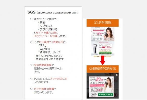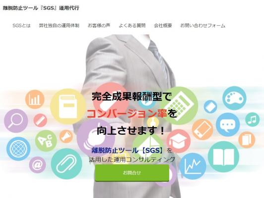 株式会社ユナイテッドゲート(代表取締役:黒田大輔、本社:東京都目黒区)が開発元のサイト全体離脱改善システムとなります。SGSはSECONDARY GUIDESYSTEMの略名で、2015年10月からサービスが開始しました。導入社数については、2017年12月現在時点で235社となっております。現状、WEBサイト全体から約97%のユーザーが離脱をしていることに着目し、このSGSではwebサイトのKPIを劇的に改善することができ、 webサイトの成果を図る基本的なKPI、コンバージョン率、アップセル率、新規獲得人数、顧客獲得単価、離脱立、直帰率、滞在時間を徹底的に改善、向上させること可能です。 そして、各指標の数値が向上すれば、WEBサイトのCV数や売上の拡大につながることができることから、数多くの企業に支持されております。
