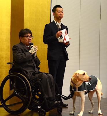 ※写真1枚目は、昨年(2017年)の募金贈呈式の一場面。介助犬使用者の木村佳友氏の挨拶の様子です。