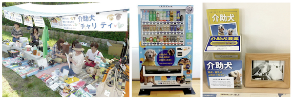 ※写真は、左からチャリティフリーマーケットの様子、介助犬支援自動販売機、募金箱です。