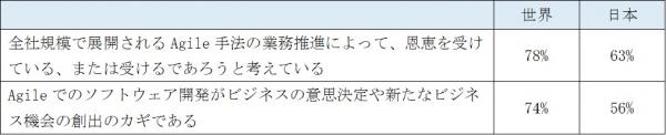 「AgileとDevOpsは企業のビジネスをどのように推進するのか」と題する本調査によると、全社規模で展開されるAgile手法の恩恵を受けている、または受けるであろうという認識、および、Agileでのソフトウェア開発がビジネスの意思決定や新たなビジネス・チャンス創出のカギであるという認識において日本の遅れが明らかになりました。