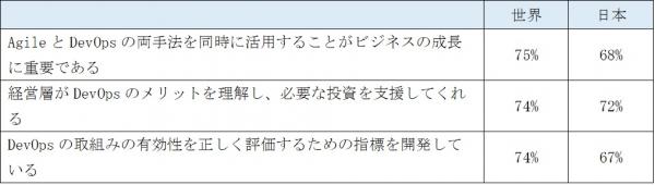 一方で、世界、日本の回答者の約7割が「AgileとDevOpsの両手法を同時に活用することがビジネスの成長に重要である」と回答し、Agile、DevOpsどちらか一方ではなく両方活用することが重要であるという認識に大きな開きは見られませんでした。また、「経営層がDevOpsのメリットを理解し、必要な投資を支援してくれる」「DevOpsの取組みの有効性を正しく評価するための指標を開発している」という回答者も世界、日本でそれぞれ約7割となり、Agileに比べると企業内におけるDevOpsの重要性の理解が比較的進んでいる結果となりました。