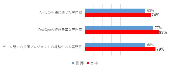 今後Agile、DevOpsの活用を推進していくうえでの課題として、世界の回答者の多くがAgileの手法に通じた専門家、DevOpsの経験豊富な専門家、およびチーム間での共同プロジェクトの経験がある専門家を見つけることが困難であると回答しました。これは日本の回答者でも同様の傾向にあり、特にチーム間での共同プロジェクトの経験がある専門家を見つけることについては、その数値は10ポイント以上も上回る結果となりました。