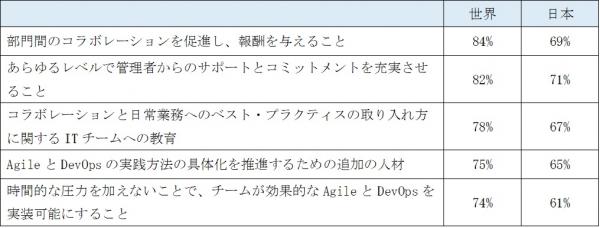 また、調査回答者がAgile、DevOps導入を推進するうえで重要だと考える項目は以下のようなものとなりました。