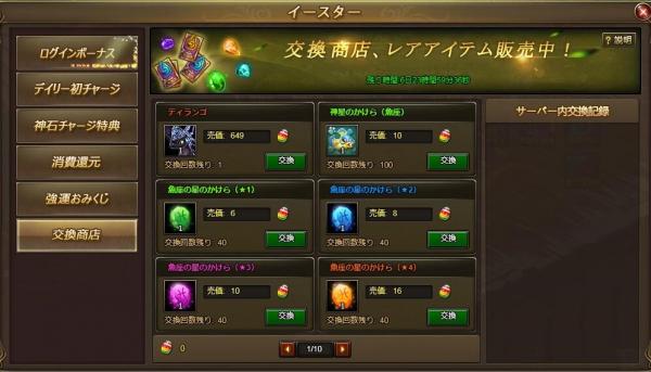 イベント期間中、指定された時間にログインするとイースターエッグを獲得する事ができます。集めたイースターエッグは、交換商店でレアアイテムと交換できます。また、今回の交換商店では新騎獣の黒竜の子供「ディランゴ」や、新バージョンで実装されたばかりの星座ペットの「かけら」等新しいアイテムを揃えております。
