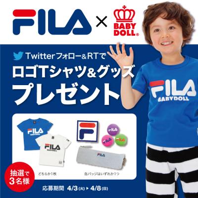 株式会社コージィコーポレーションが運営するベビー・キッズ服ブランドBABYDOLL(ベビードール)が、BABYDOLL公式Twitter(@starvations)をフォロー&キャンペーンツイートをRTで「FILAロゴTシャツ1枚&FILAグッズ」が抽選で3名様に当たる!<FILAコラボ発売記念★Twitterキャンペーン>を開催します。