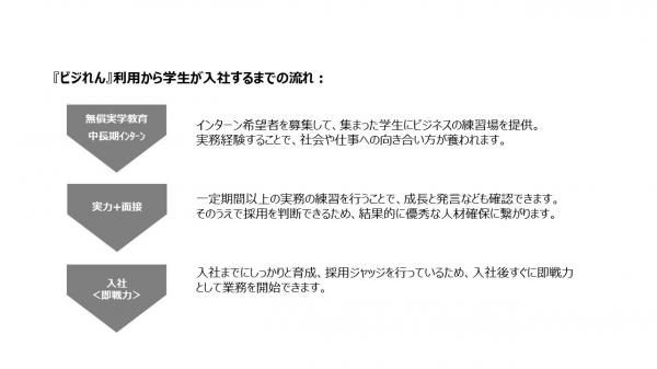『ビジれん』は、ITを活用した中長期のインターンシップで、実務経験が全くない新卒学生が入社までに仕事の仕方や実務の練習を通じて、即戦力としての育成が可能になる、今までにない新しいサービスです。学生にとっては、仕事の練習を通じて生き方をも身に着ける場として、企業にとっては、よりよい人材を生み出し続ける場として機能し、単なる就業体験にとどまりません。