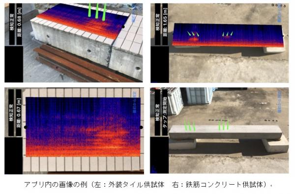 この問題に対して、当社の持つスマートフォン用アプリの開発技術を適用し、また新たに AR(Augmented Reality・拡張現実)技術を導入することで、時間周波数分析画像を効率的に実構造物と関連付けて表示させるシステム(アプリ)を実現しました2)。現状のアプリは未だ機能的な制約が多くあるものの、打音検査および診断に対して新たな方向性を示すとともに、作業効率を飛躍的に改善するものです。また、対象は外装タイルおよびコンクリートとしていますが、金属材料やその他の環境測定にも応用は可能と考えられます。