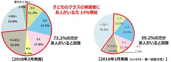 また、2016年2月に実施した同内容の調査結果では、子どものクラスの保護者に友人がいると回答した方の合計は59.2%でした。この結果と比較すると14%増加したことがわかりました。その他、「5人以上友人がいる」と回答した方で9.2%の増加、「いない」と回答した方は17%減少といった結果になりました。