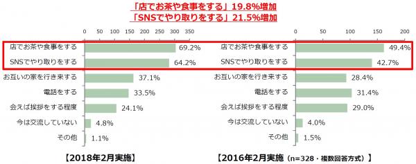 ・保護者同士の交流方法「店でお茶や食事をする」「SNSでやりとりをする」が2年前の同調査結果と比較し20%も増加
