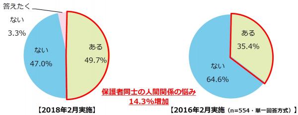 2016年2月に実施した同内容の調査結果と比較すると、「ある」と回答した方が14.3%増加、「ない」と回答した方が17.6%減少したことが分かりました。保護者同士の交友関係の増加、交流関係が変化している中、人間関係のトラブルも増えてきていることがうかがえます。