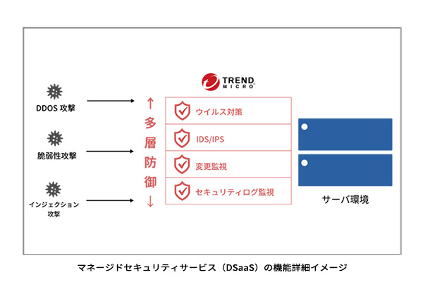 マネージドセキュリティサービス(DSaaS)は、ウイルス対策・IPS/IDS など多くのセキュリティ機能を持ち、さまざまな攻撃からの多層防御を実現します。今回提供するサービスは、ライセンス提供 / 初期セットアップ代行に加えて、エージェント監視や侵入防御ポリシー変更、アラート検知時の通知設定などの運用を代行するものです。