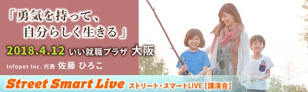 20代の転職支援サービスを手掛ける、20代の転職相談所【運営:ブラッシュアップ・ジャパン(株)東京都新宿区 代表:秋庭洋】では、20代の社会人を対象とした講演会「Street Smart Live」を定期的に開催。第2回目となる4月12日(木)大阪開催の講演会には、セブ島在住の佐藤ひろ子さんが登壇し、『勇気をもって、自分らしく生きる』というタイトルで講演します。※参加は無料(要事前予約)