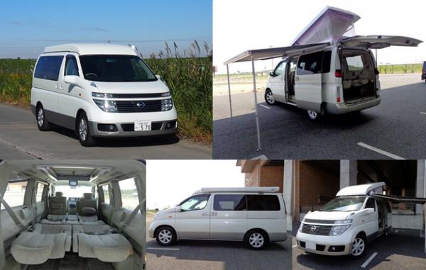 ポップアップルーフ、オーニングテントが付いたエルグランド。車内は通常の乗用車と変わらない仕様となっており、最大8人まで乗車が可能。キャンパー装備はいらないけど簡単に車中泊したい、という方にもおススメ。