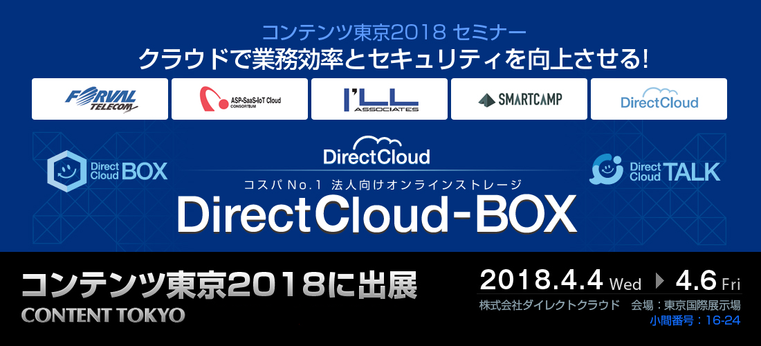 法人向けオンラインストレージ「DirectCloud-BOX」を中心に様々なクラウドサービスを手掛ける株式会社ダイレクトクラウド(本社:東京都新宿区、代表取締役社長:安 貞善)は2018年4月4日(水)から4月6日(金)まで東京ビッグサイトにて開催される「第6回 コンテンツ 配信・管理 ソリューション展」に出展いたします。