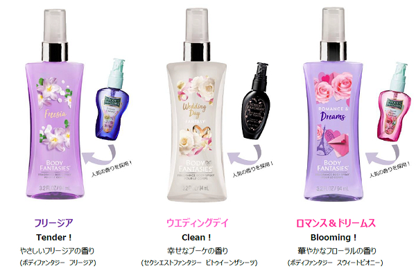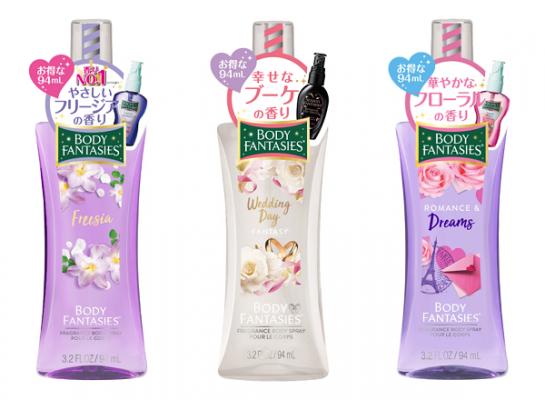 先行発売する3商品は、「フリージア」「ウエディングデイ」「ロマンス&ドリームス」で、香りは『ボディファンタジー』『セクシエストファンタジー』の人気の香りを採用。