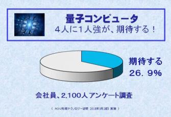 この調査では、一般企業で働く会社員、経営者、2100人にアンケート調査を実施したところ、量子コンピュータに対する期待は29.6%で、4人に1人強の人が、量子コンピュータを前向きととらえていることが分かった。