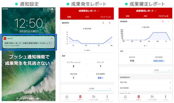 「A8.netアプリ」は、A8.netにアフィリエイトメディアとして登録する会員が無料で利用出来るスマートフォンアプリです。A8.netの人気機能に、アフィリエイト成果(確定されるとメディアの報酬となるもの)が発生した際、管理画面にログインするとオリジナルキャラクターの「エーハチくん」が出てきて知らせる「未確定速報通知機能」がありますが、「A8.netアプリ」では成果発生を知らせるプッシュ通知機能も搭載しており、スマートフォンアプリならではの機能で一層のモチベーション向上を図ります。その他、成果発生・確定状況の確認や参加中のプログラム(アフィリエイト広告案件)の情報確認などが行なえ、パスコード認証・生体認証機能搭載により外出先でも安全かつ手軽な管理画面アクセスを可能にしました。今後は、プログラム検索機能や広告リンクコード生成機能といった機能も実装し、7月にはパソコン上で行える基本機能を「A8.netアプリ」に実装しスマホ上で完結できる環境を整えます。
