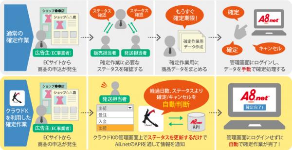 クラウドKは顧客管理から受注、出荷、入金その他、通販事業に必要な機能をオールインワンで提供する通信販売事業者向け基幹システムです。複数のECモール等に出店している場合にも各ECサイトの情報をクラウドK上で一括管理出来る強みがあり、今回のシステム連携によってクラウドKを利用していればA8.netの確定作業もすべてクラウドK上で完結出来るようになりました。広告主は「クラウドK上の商品ステータスが『(購入者からの)入金完了』で『A8.netの成果を確定』」等事前に確定/キャンセル条件を指定しておけば、以降クラウドK上で商品ステータスを変更するだけでA8.netのAPI(※1)を通じて自動で確定作業が行われます。A8.netでは今回の連携を通じて、広告主の業務負担を軽減し、広告主の生産性向上と、プロモーション業務への集中による売上向上のサポートを目指します。