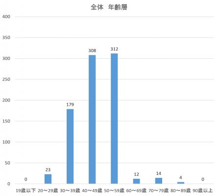 【年齢層・全体】19歳以下:0、20~29歳:23、30~39歳:179、40~49歳:308、50~59歳:312、60~69歳:12、70~79歳:14、80~89歳:4、90歳以上:0