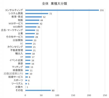 【業種・全体】コンサルティング:231名、システム開発:72名、教育・育成:52名、物販:44名、WEBサービス:42名、WEB制作:35名、広告・マーケティング:31名、士業:30名、その他サービス:28名、出版関係:23名、不動産管理:21名、カウンセリング:21名、EC:21名、輸出入:18名、FP:17名、美容:16名、イベント企画:16名、マッチング:13名、映像関係:11名、派遣(派遣業以外):10名、結婚サービス:8名、スポーツ:6名、ツーリズム:5名、対象外:1名、その他:80名