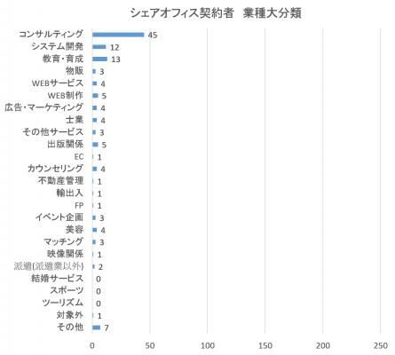 【業種・シェアオフィス】コンサルティング:45名、システム開発:12名、教育・育成:13名、物販:3名、WEBサービス:4名、WEB制作:5名、広告・マーケティング:4名、士業:4名、その他サービス:3名、出版関係:5名、不動産管理:1名、カウンセリング:4名、EC:1名、輸出入:1名、FP:1名、美容:4名、イベント企画:3名、マッチング:3名、映像関係:1名、派遣(派遣業以外):2名、結婚サービス:0名、スポーツ:0名、ツーリズム:0名、対象外:1名、その他:7名