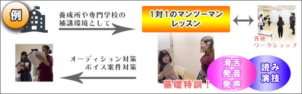 これまで自社の所属声優やナレーターだけに提供していたマンツーマンレッスンの育成環境、及びメソッドを、一般に向けてカスタマイズ。「声の偏差値を上げる」をスローガンに、個別指導にて「声を操るプロ」としての基礎スペック向上を目指します。