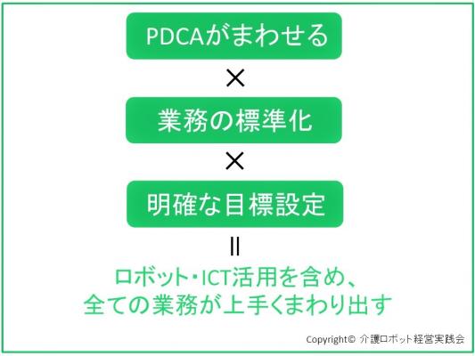 PDCAをまわせるようになれば、あらゆる面で問題解決能力が高まります。今後の普及が期待されるICTや介護ロボットなどを組織の中で上手く活用していくために必要なことも、まさにPDCAサイクルをまわせるようになることです。