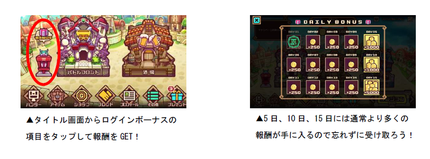 サービス開始となる本日より、ログイン日数に応じて報酬をプレゼントいたします。15日間ログインすると合計10,000ゴールド、15日以降もログインするごとにログインボーナスは配布されます。毎日ログインして豪華報酬を手に入れましょう!また、全国のユーザーとランキングを競いあう「第1回バトルキャンペーン」が近日開催予定!キャンペーンの実施までにお気に入りのハンターを育てましょう!『LINE トロッコウォーズ』のその他の詳細については、ゲーム内のお知らせや、公式サイト(URL: https://toroccowars.jp )をご確認ください。
