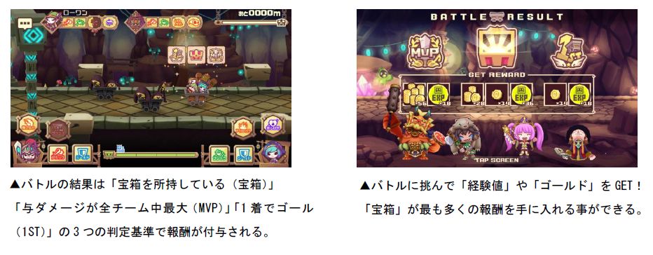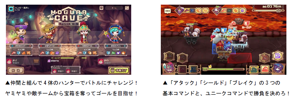 ゲームの中核をなすバトルは約3分ほどで行われます。1台のトロッコには4体のハンターを乗せることができ、プレイヤー自身はそのうち2体のハンターを操作します。3つの基本コマンドと、ハンター固有のユニークコマンドを駆使し、敵CPU「ヤミヤミ」や敵ハンターから宝箱をGETしてゴールを目指せ!