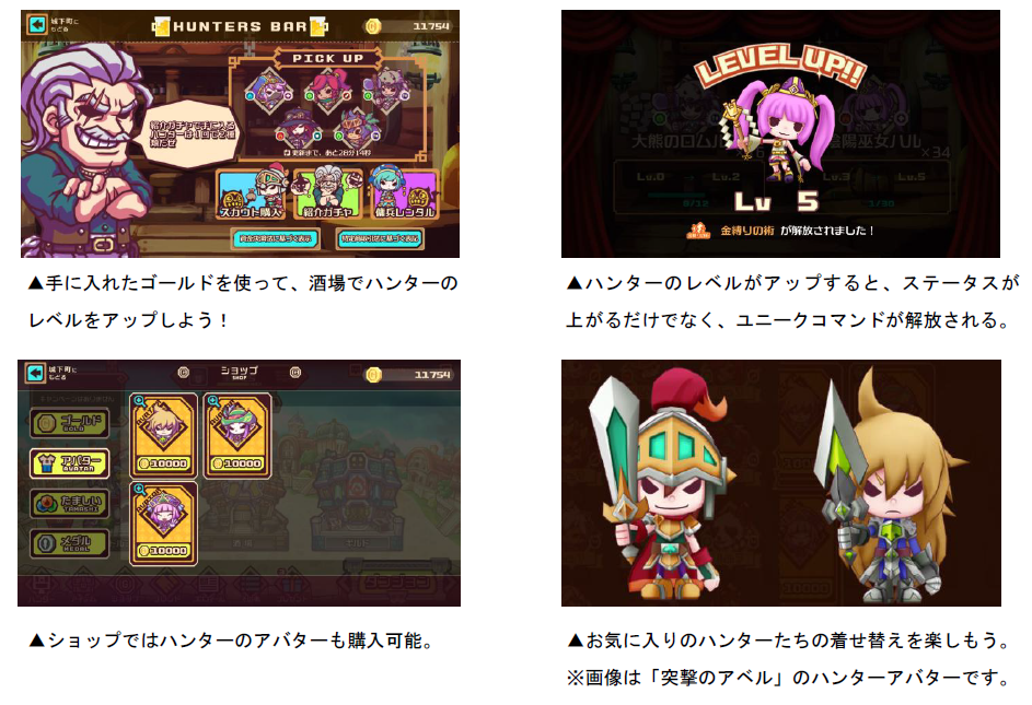 バトルでゴールドを手に入れると、それを元に「酒場」でハンターを入手・レベルアップできます。同じハンターを複数体手に入れると、ハンターのレベルがアップします。強化したハンターを使って更なるバトルに挑みましょう!また、「ショップ」では、ゴールドを使ってハンターのアバターを手に入れる事もできます。お気に入りのハンターを自分好みにカスタマイズしましょう!