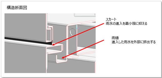 パッキンに代わるスカート構造と雨樋の併用により扉開閉性を落とさずに防水性を確保