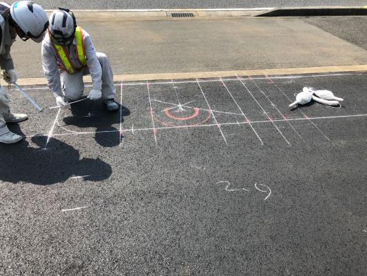 今回のマーク施工:軽×5箇所、矢印×2箇所、停止線W300×1、IN×1、OUT×1箇所