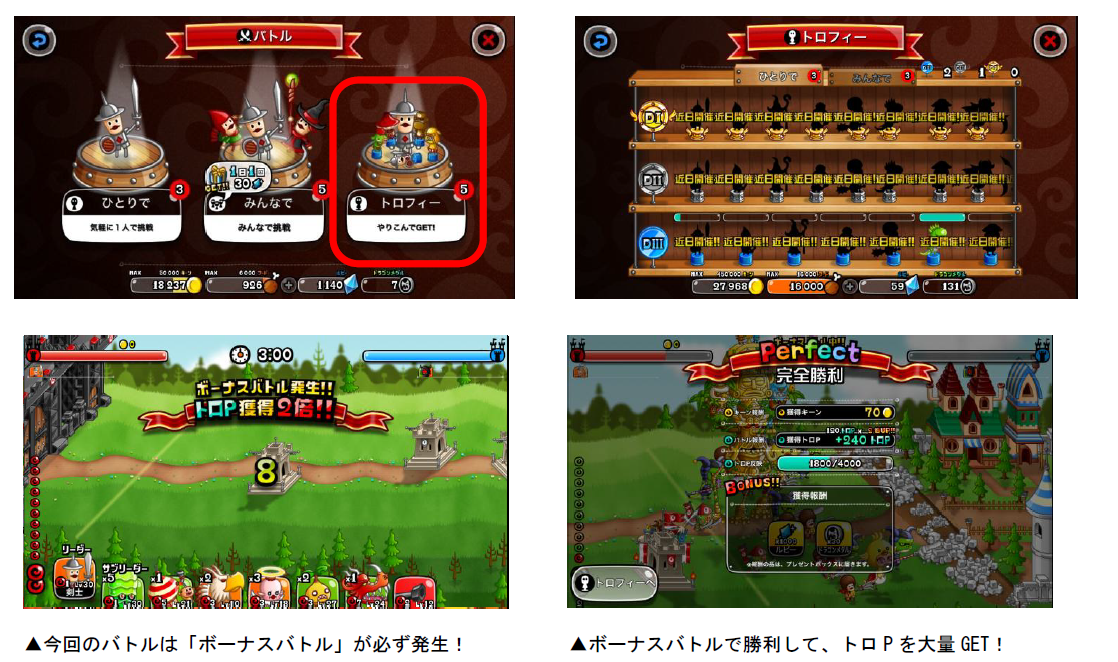 各キャラのトロフィーは、「トロP」を一定数貯めると獲得することができます。トロPを獲得するには、「キャラのLvが20以上」「うまP200以上」など各キャラによって条件が異なります。条件を満たした状態でバトルを行なうことでトロPを獲得できます。また今回は「ボーナスフィーバー」が同時開催され、全てのトロフィーバトルが、獲得トロPが2倍以上となります。「ボーナスバトル」はバトルの勝敗に関係なく、獲得トロPが2・3・5・10倍のうちいずれかの倍率で増加します。「ボーナスバトル」で勝利してトロPの大量獲得を目指しましょう!
