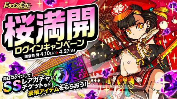 期間中、15日間ログインすると、「竜石」が最大15個もらえる「桜満開ログインキャンペーン」を開催いたします。また、5日ログインごとに「レアガチャチケット」や「Sレアガチャチケット」など豪華アイテムをプレゼント!ログイン15日目には「SSレアガチャチケット」が必ずもらえます。『ドラゴンポーカー』に毎日ログインして、豪華報酬を受け取りましょう!
