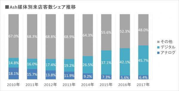 スマートフォンの普及やSNS等の発達に伴い、集客方法の多様化が進むなか、美容室 Ashは2017年の年間入客数が前年同期比103.2%という結果となりました。集客の主な施策として、公式ホームページを中心にスタイル写真やブログ、美容コラムなど、美容コンテンツの強化を図って参りました。WEB媒体からの来店客比率は年々増加しており、2017年は全体の45.7%を占めております。引き続きWEB媒体のコンテンツ強化を図ることでサロンの魅力発信に勤めて参ります。