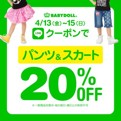 株式会社コージィコーポレーションが運営するベビー・キッズ服のBABYDOLL(ベビードール)がBABYDOLL(ベビードール)・STARVATIONS(スターベイションズ)各店、通販各店にて、4月13日(金)~15日(日)の3日間限定< LINEクーポン★パンツ・スカート★20%OFF >を開催します。